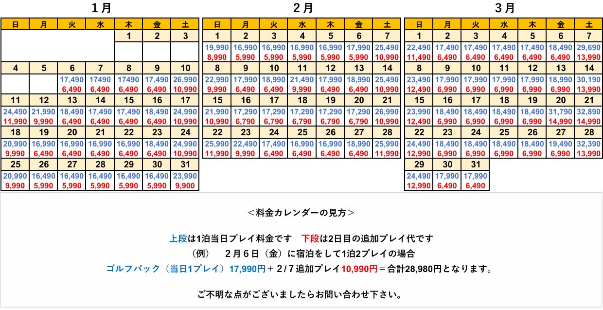 <基本料金に含まれる物> 宿泊費(洋室・和室・和洋室/2~8名1室利用)・食事(夕食1回・昼食2回・朝食1回)・2プレイ代(グリーンフィ・乗用カート・諸経費) |